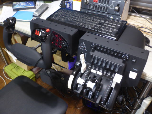 レバーを単発プロペラー機用に変えました。 黒・・・スロットル 青・・・プロペラ 赤・・・ミックスチャー Saitekパネルを右斜めに置きました。 ハニーカムスロットルに付いているオートパイロット用のボタンやつまみを使ってみましたが使い難かったです。 設定値はモニター上の計器パネルに表示されますが場所を探す必要があるからです。 その点、Saitekマルチパネルはつまみの直ぐ左に設定値が表示されるので設定しやすいです。 旅客機のMCPとしても利用できそうです。 ヤフオクに出すつもりでしたが残します。 Saitekスイッチパネルはヤフオクに出すつもりです。 |