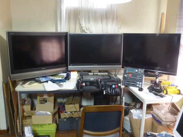 フライトシミュレーターをプレイする場所全体の写真 カーブスクリーンのコックピットが別の部屋にありますが起動に手間がかかるのと部屋を暗くしなければならないのであまりプレイする気になりません。 その点、こちらは直ぐに起動できるし部屋を暗くする必要がないので気軽にプレイできて良いです。 |