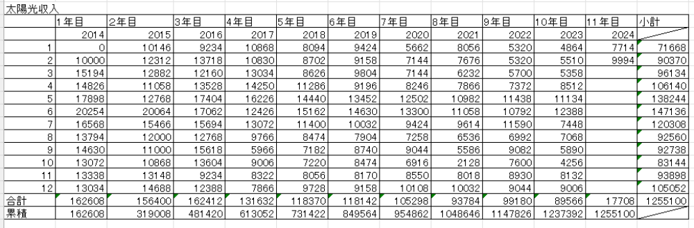 2024年1月18日に固定価格買取が終了しました。 2024年2月に最後の売電金額が入金されました。 太陽光売電収入合計額は125万円になりました。 設置費用が125万円でしたのでちょうど元が取れました。 全発電量の内約30%を自家消費量と仮定して、 1年当たりの平均データは下記の通り。 総発電量・・・4286kwh 自家消費量・・・1286kwh 売電量・・・3000kwh 自家消費節約金額 32150円(単価25円で計算) 売電金額・・・・・・125400円(単価38円x1.1=41.8円で計算) 固定価格買取後の金額は下記の通り。 自家消費節約金額 32150円(単価25円で計算) 売電金額・・・・・・27000円(単価9円で計算) 今後は1年当たり59150円の利益が生じる計算です。 |