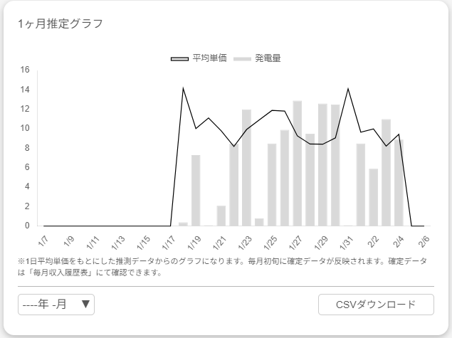棒グラフが発電量で折れ線グラフが買取単価です。