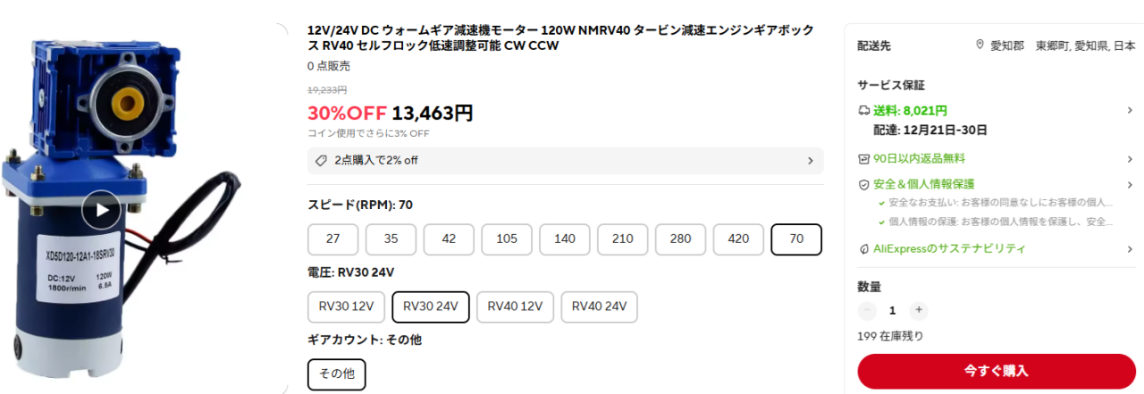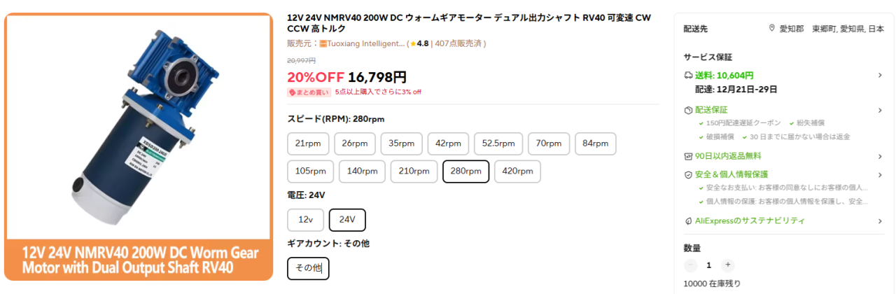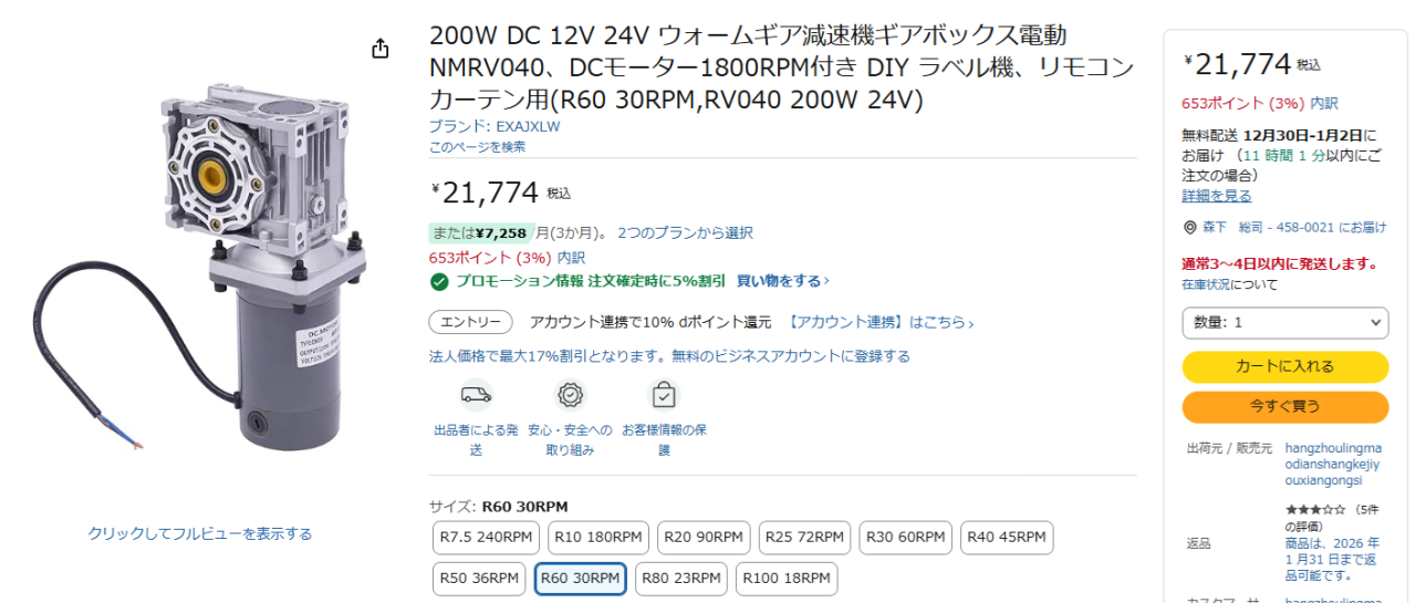 下記はAliExpressで販売されているギヤモーターです。 2種類の減速比が用意されています。 トルクは下記のこのサイトで計算できます。 回転数は75rpmが良いかと思います。 トルク・・・3.247kgm(レバー50mmの力64.94kg) amazonで販売されているものと同じようです。 採用不可。 |