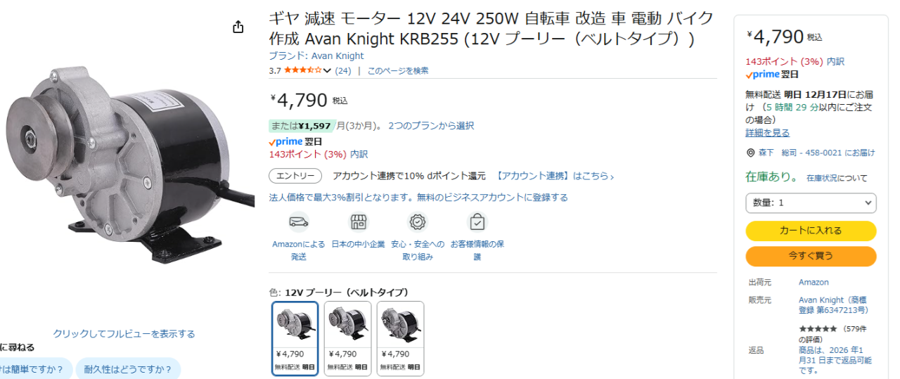 写真はamazonで販売されている電動車いす用のモーターです。 価格・・・5,700円 電圧・・・DC24V 出力・・・250W 回転数・・・10rpm トルク・・・24kgm(出力と回転数からの計算値) 回転数から1秒で回転する角度にすると60度になります。 ちょっと遅いので使えません。 |