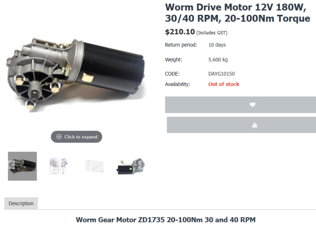 下記はAliExpressで販売されているウォームギヤモーターです。 多くの減速比が用意されているので最適なモーターを選択できます。 トルクは下記のこのサイトで計算できます。 回転数は35rpm程度が良いかと思います。 120Wのトルク・・・3.34kgm(レバー50mmの力66.8kg) 200Wのトルク・・・5.566kgm(レバー50mmの力111.328kg) |