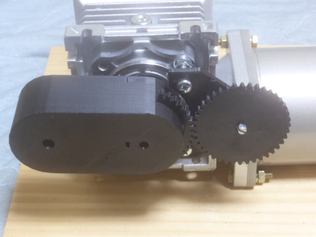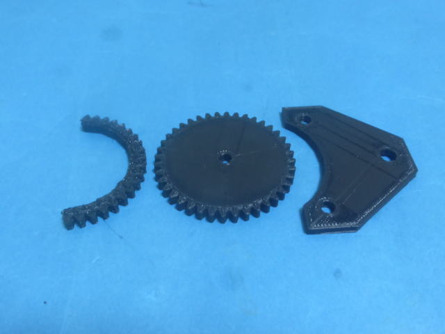 アームの角度を制御回路へフィードバックする必要があります。 角度の検出は可変抵抗を使います。 可変抵抗のブラケットと連結用ギヤーを作りました。 左の半分のギヤーは接着剤でレバーに取り付けます。 |