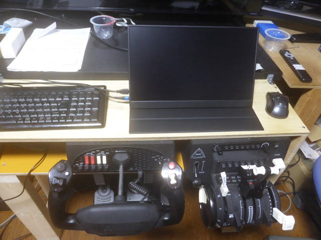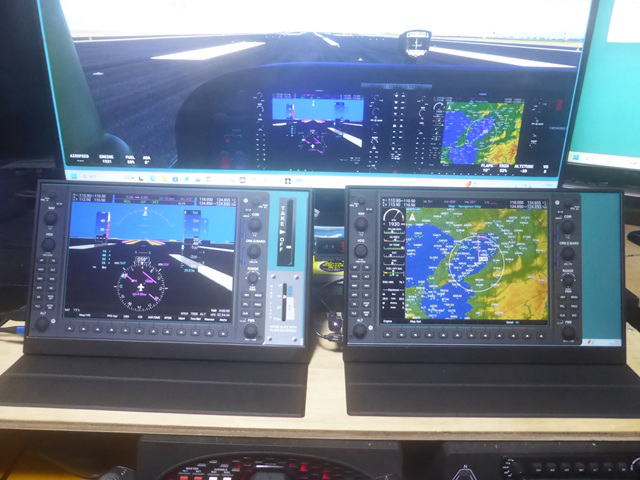 15.6インチのモニターを2台にしました。 セスナ172のG1000と同じように左にPFD、右にMFDを表示しました。 計器類が手前に来て操作もできるので操縦し易くなりました。 メイン画面に表示される計器類は離れているため見にくかったですし、カメラを外部に切り替えた時は表示されません。 タッチモニター追加により近くで常に表示されとても操作しやすくなりました。 |