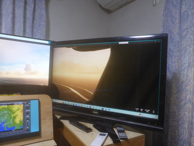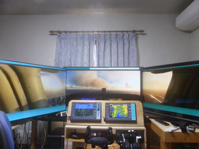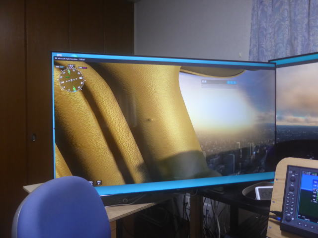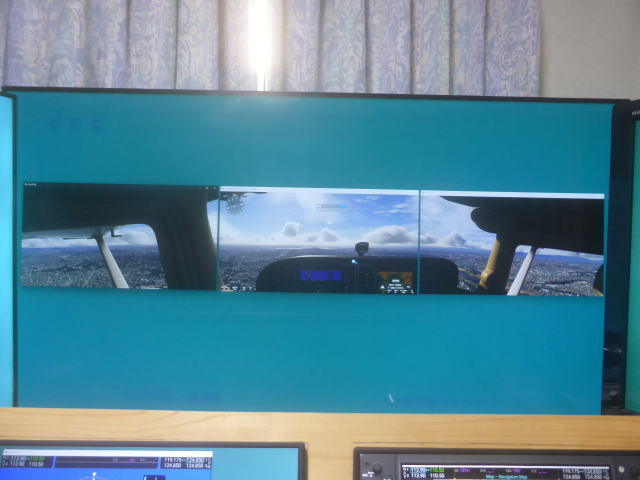 シングルウインドウ正面 マルチウインドウと比較して側面の表示範囲が少ないです。 シングルウインドウはシーナリーのウインドウ1個のみでこの写真は横方向をモニター3台分まで拡大して表示しています。 正面を見たまま視角を大きくしただけで横方向は見えません。 |