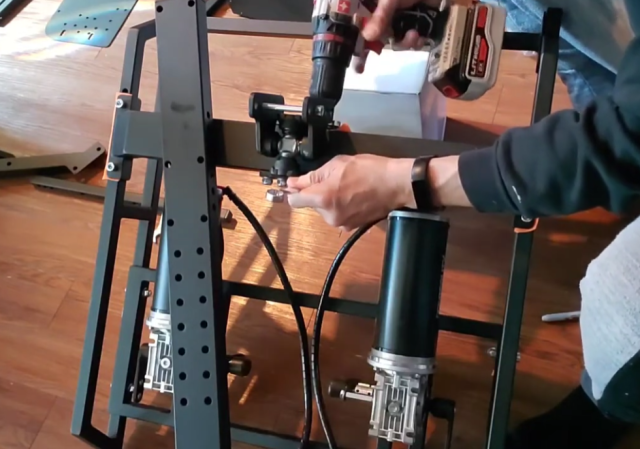 参考の写真です。 これはDOF REALITY社の2DOFプラットフォームの組み立て中の写真です。 触っている部分に十字シャフトがあります。 サイズはそれほど大きくないです。 |