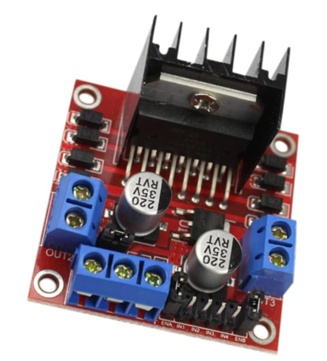 モータードライバーです。 2台のモーターの正転、逆転を制御できます。 L298N モータードライバー価格はamazonで365円です。出力電流が不足していて使えないのでこの金額は合計に含めません。 |