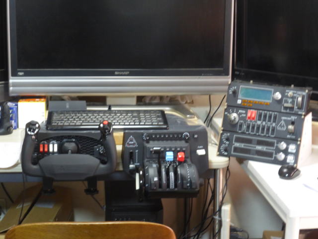 レバーを単発プロペラー機用に変えました。 黒・・・スロットル 青・・・プロペラ 赤・・・ミックスチャー Saitekパネルを右斜めに置きました。 ハニーカムスロットルに付いているオートパイロット用のボタンやつまみを使ってみましたが使い難かったです。 設定値はモニター上の計器パネルに表示されますが場所を探す必要があるからです。 その点、Saitekマルチパネルはつまみの直ぐ左に設定値が表示されるので設定しやすいです。 旅客機のMCPとしても利用できそうです。 ヤフオクに出すつもりでしたが残します。 Saitekスイッチパネルはヤフオクに出すつもりです。 |