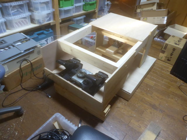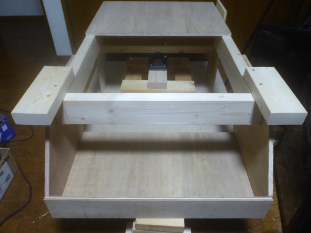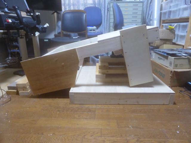 モーションシムの土台を作りました。 中央にユニバーサルジョイントを取り付けてあります。 |