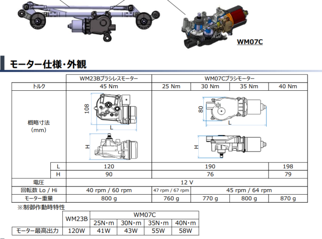 残りはモーターです。 実はモーターの選定で悩んでいます。 中古のワイパーモーターを使う予定ですがトルクが足りるかどうかが心配です。 左の図はミツバのワイパーモーターのカタログです。 WM07Cの30Nmの仕様は下記の通りです。 電圧・・・DC12V 出力・・・43W 回転数・・・64rpm トルク・・・30Nm(約3kgm) 回転数とトルクから計算すると出力は200Wになるんですけど43Wと表示されています。矛盾があります。 トルクが3kgmという事は50mmのレバーの回転力は60kgになります。 何とか足りそうではありますがW数が小さいのが不安です。 |