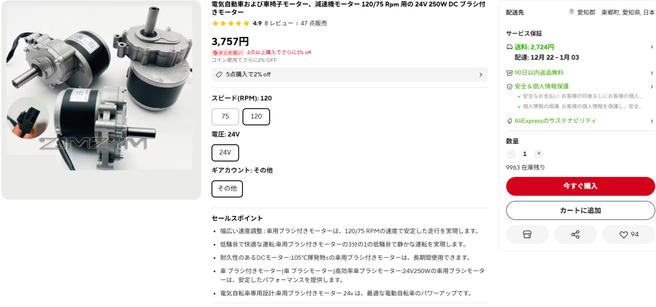 写真はamazonで販売されている電動車いす用のモーターです。 価格・・・5,700円 電圧・・・DC24V 出力・・・250W 回転数・・・10rpm トルク・・・24kgm(出力と回転数からの計算値) 回転数から1秒で回転する角度にすると60度になります。 ちょっと遅いので使えません。 |
