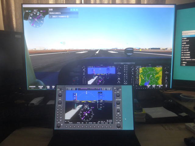15.6インチのモニターを2台にしました。 セスナ172のG1000と同じように左にPFD、右にMFDを表示しました。 計器類が手前に来て操作もできるので操縦し易くなりました。 メイン画面に表示される計器類は離れているため見にくかったですし、カメラを外部に切り替えた時は表示されません。 タッチモニター追加により近くで常に表示されとても操作しやすくなりました。 |