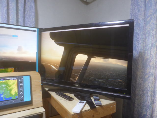 シングルウインドウ正面 マルチウインドウと比較して側面の表示範囲が少ないです。 シングルウインドウはシーナリーのウインドウ1個のみでこの写真は横方向をモニター3台分まで拡大して表示しています。 正面を見たまま視角を大きくしただけで横方向は見えません。 |