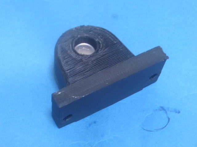 十字シャフトを固定する軸受けを3Dプリンターで作りました。 試作品のため十字シャフトの穴は貫通しています。 |